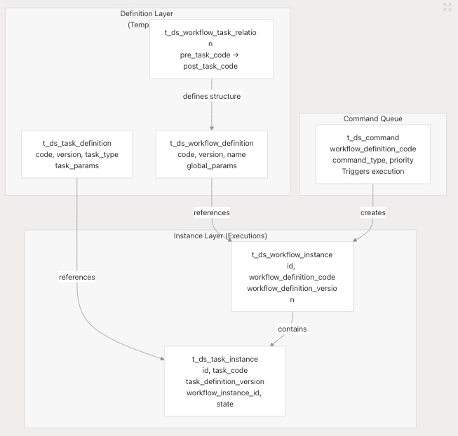 DolphinScheduler 严格区分定义(模板)和实例(执行)。这实现了版本控制、并发执行和审计跟踪。