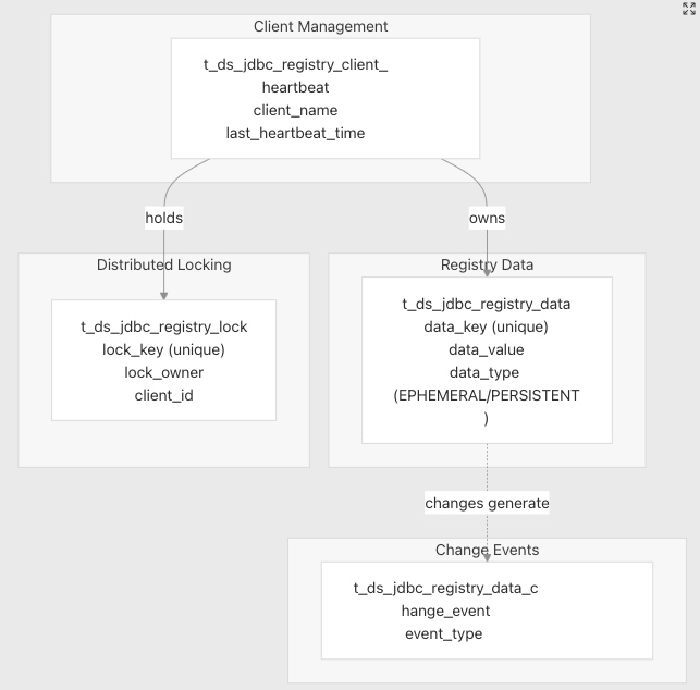 | 服务注册 | 基于 JDBC 的协调(ZooKeeper 的替代方案) | t_ds_jdbc_registry_* 表 |