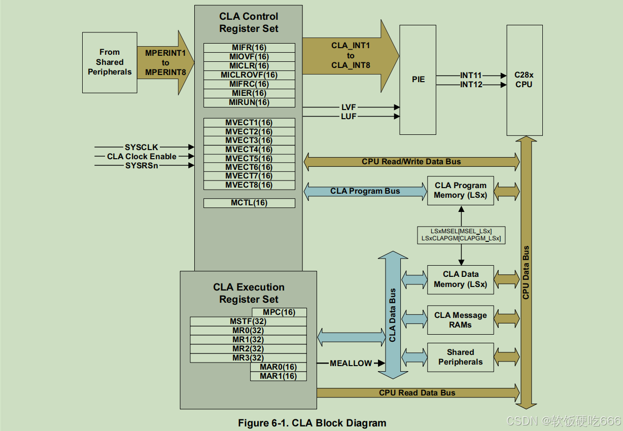 - CLA 至 CPU 消息 RAM:CLA 可通过该存储块向 CPU 传输数据,CLA 对其拥有读写权限;CPU 仅可对其执行读操作,对该存储块的写操作会被直接忽略。
