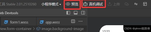 现在应该可以看到右侧的预览已经正常工作了,可以点击开发平台上方的预览或者真机调试,可以用手机扫二维码测试页面效果: