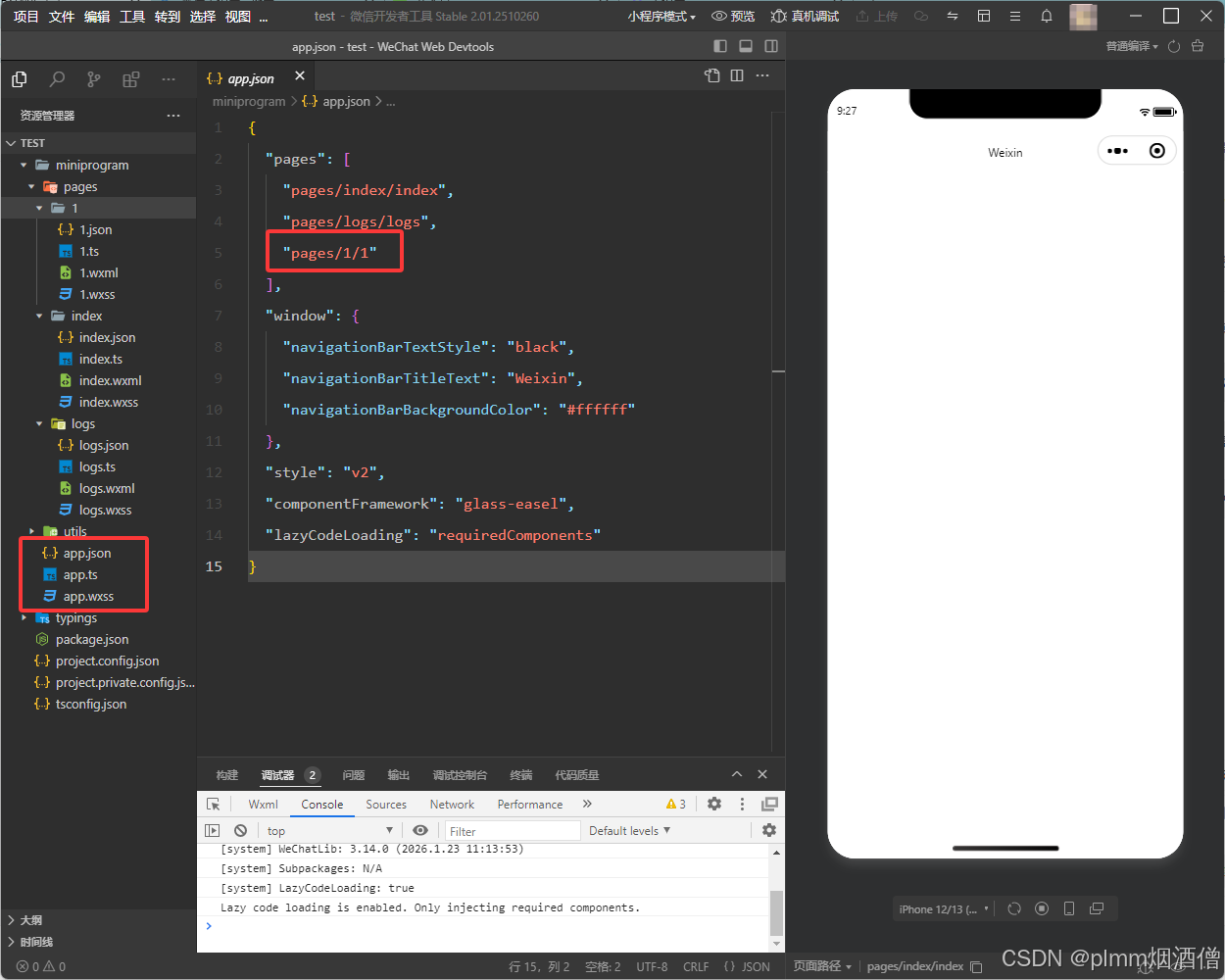 名称为 app 的是项目的整体配置文件,新建的 page 会自动添加到 app.json 文件内: