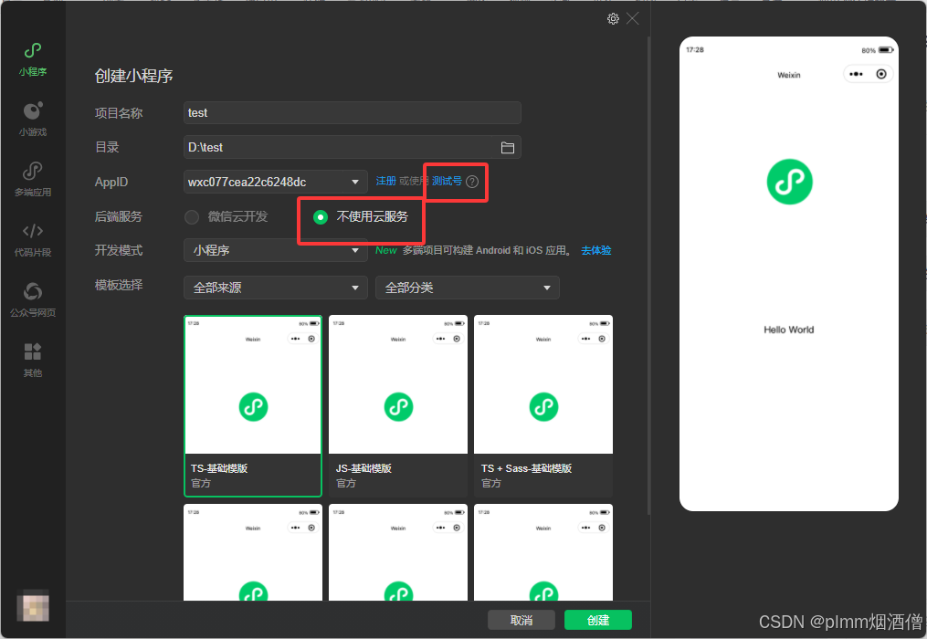 如果第一次使用,我建议创建测试号,会自动填充一个 AppID,先熟悉开发页面,后续再考虑增加云开发功能,因为这个需要与具体账号绑定。