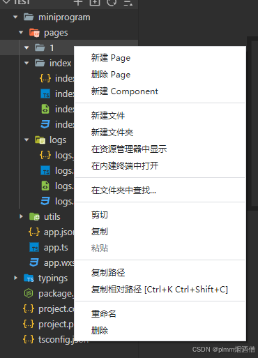 如果需要添加新的页面,在 pages 下新建文件夹,然后右键新的文件夹,新建 page 就会自动创建以上四个文件: