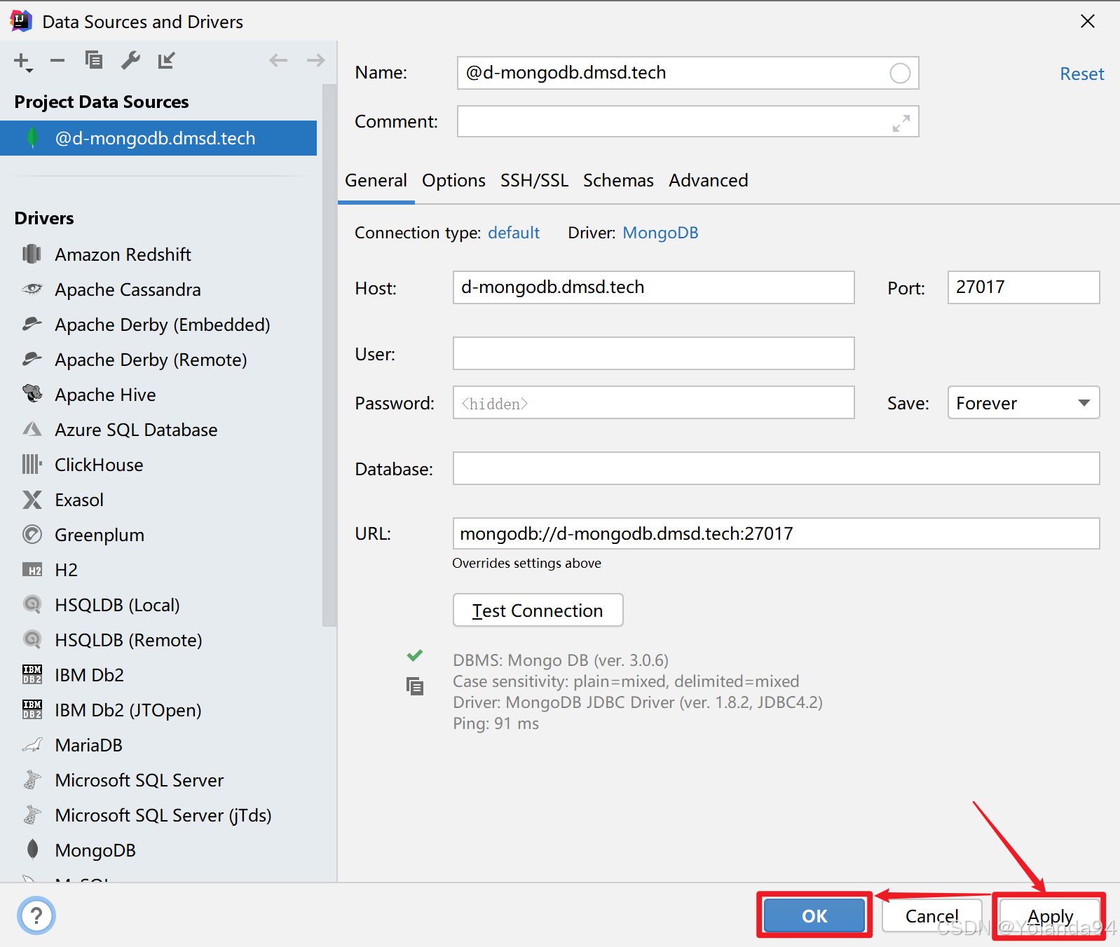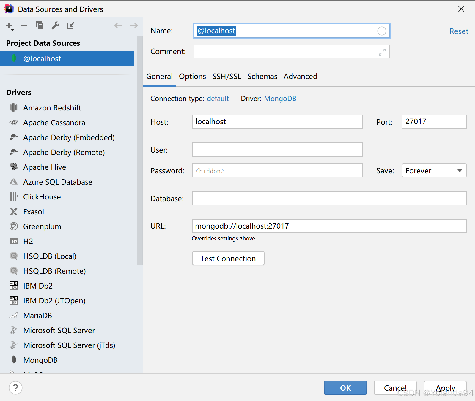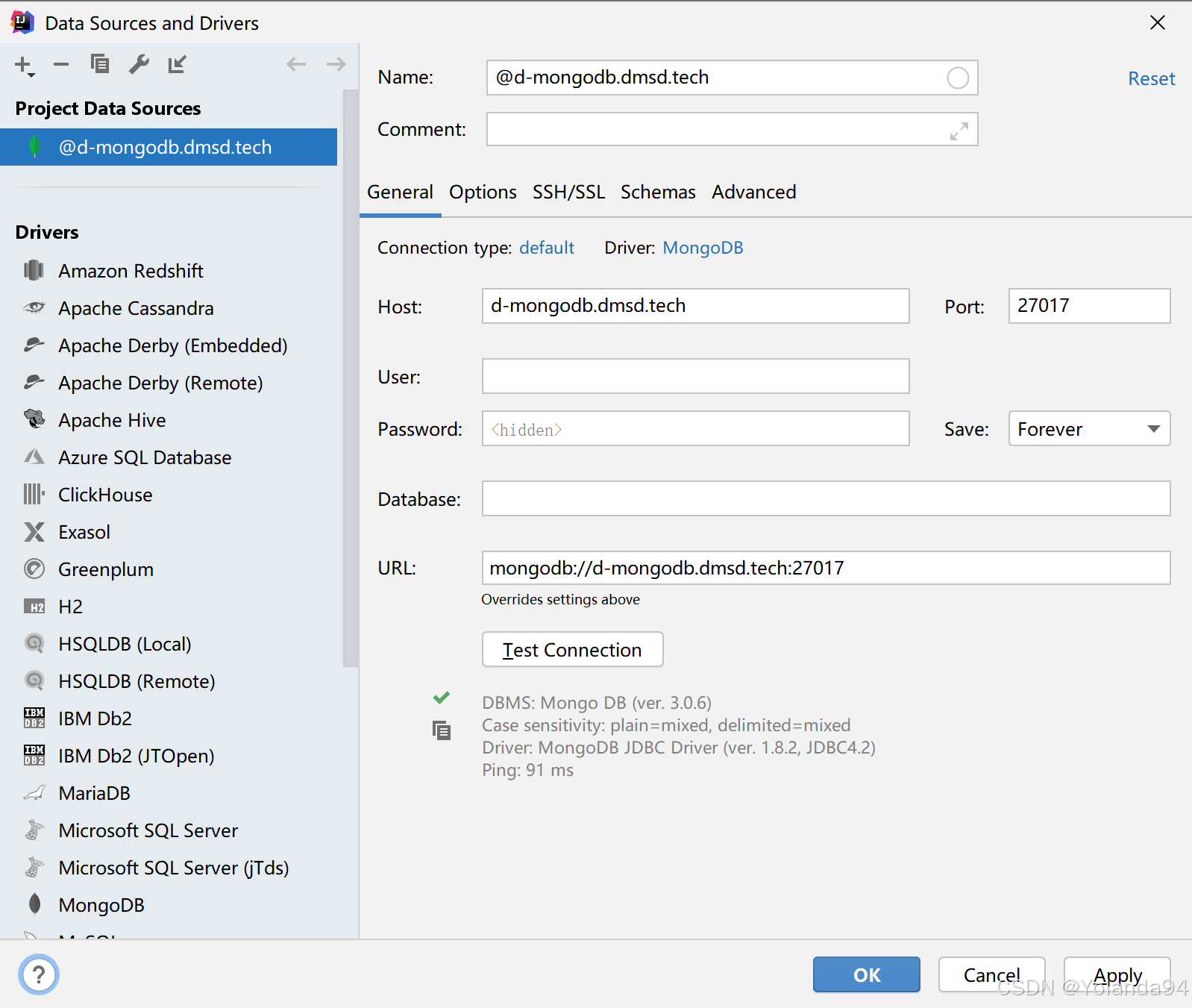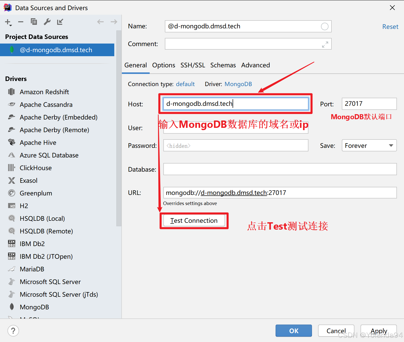 三、在弹出的"Data Source and Drivers"窗口填写要连接的MongoDB数据库信息。