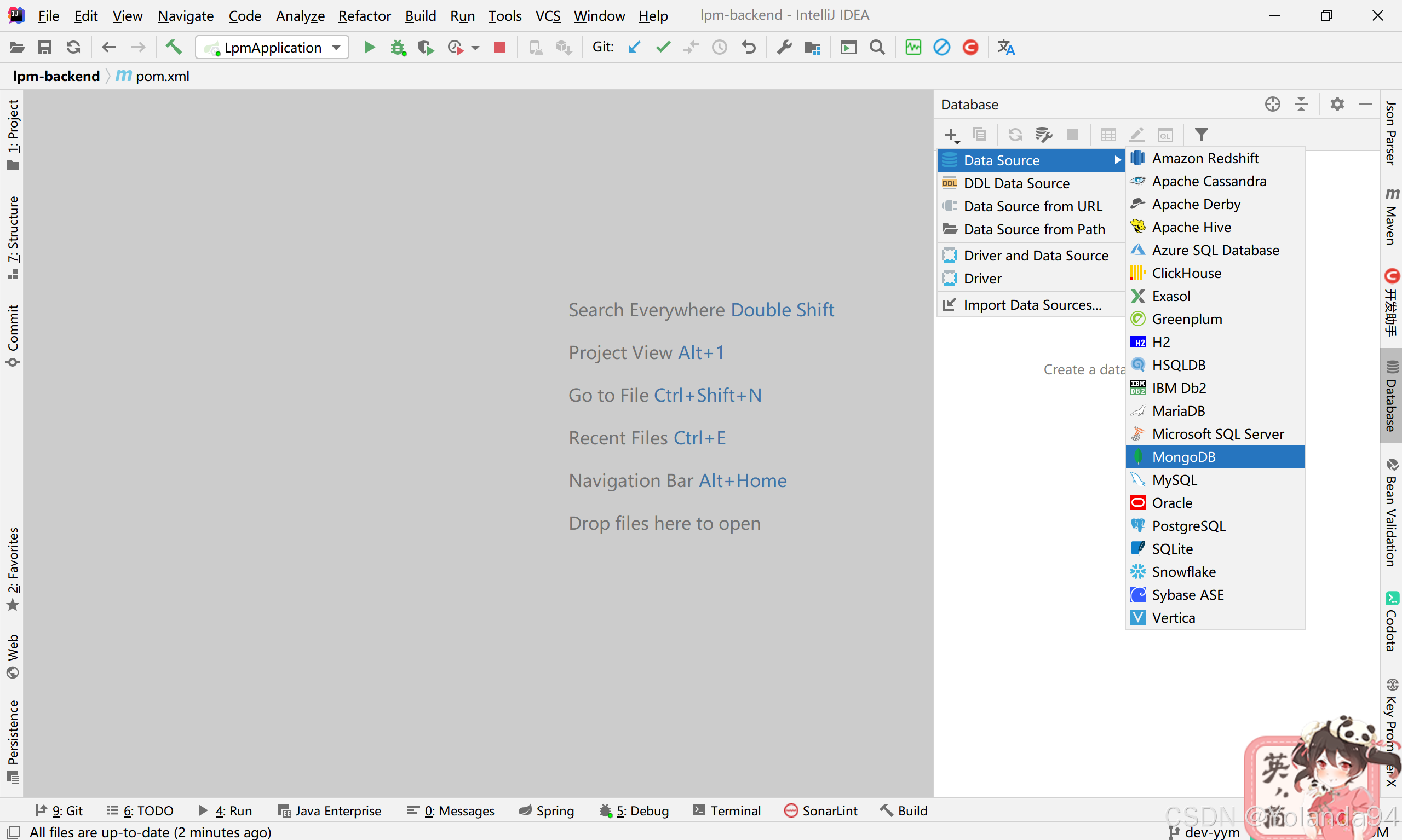 二、在Database小窗口上的"Data Source",选择"MongoDB"数据源。
