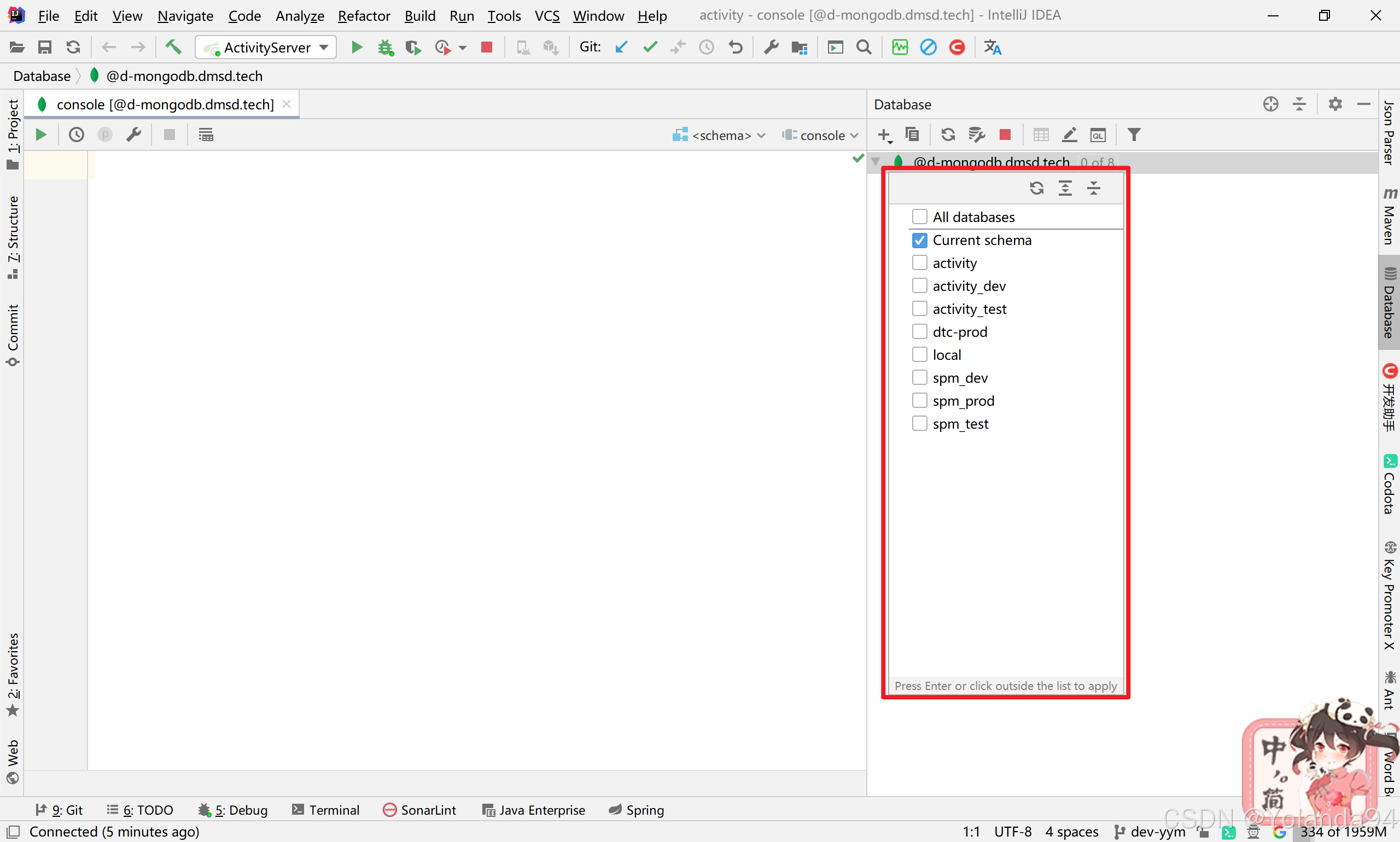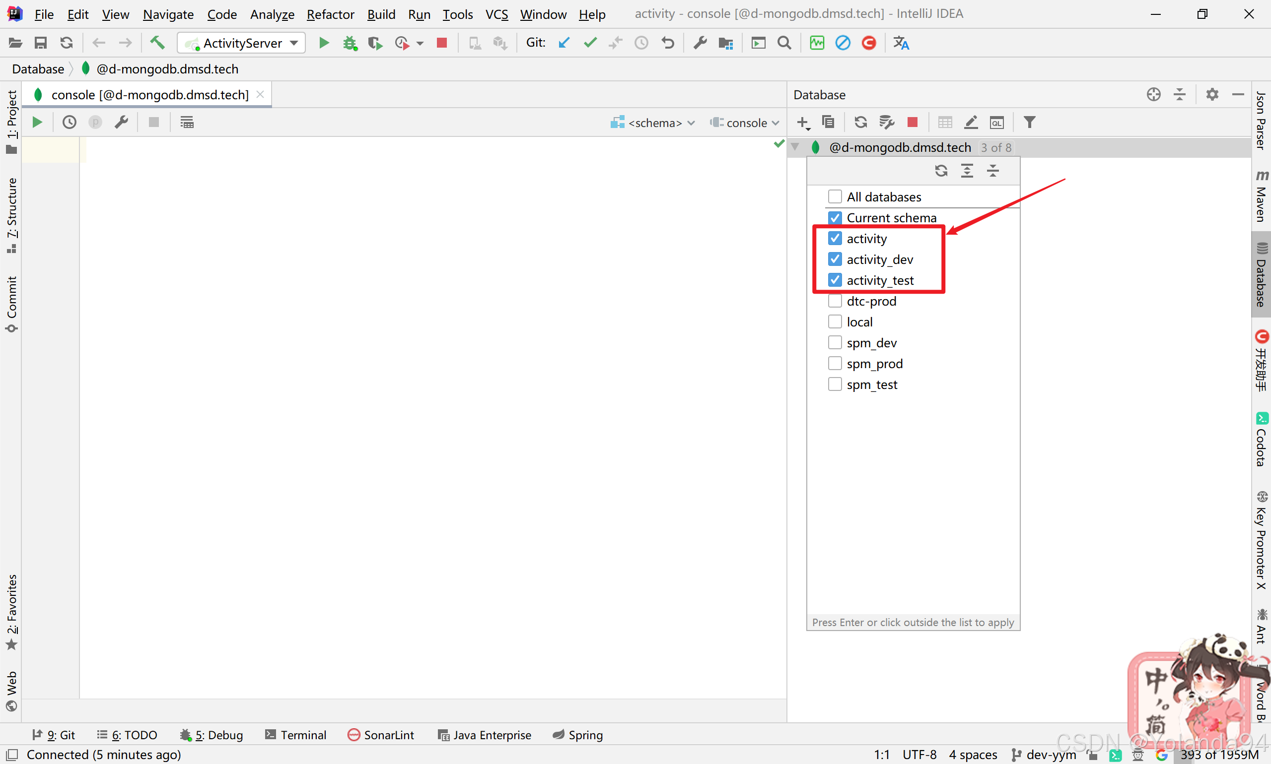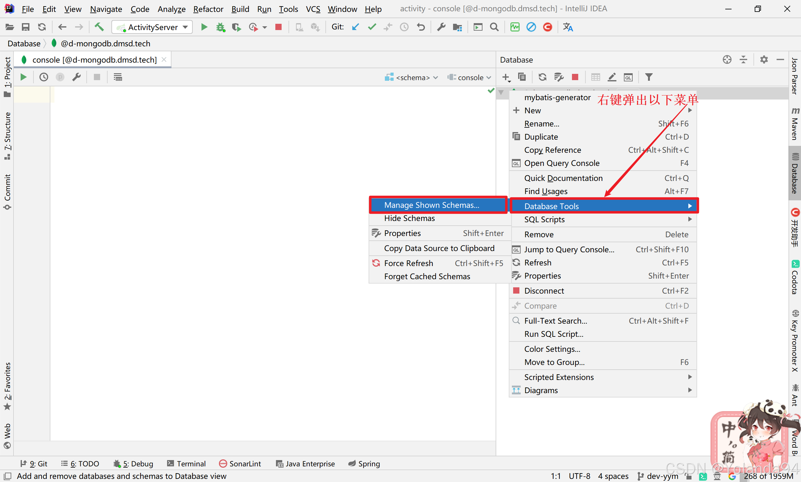 - 五、保存连接后将MongoDB数据库连接下的所有需要展示的Schemas选中后展示。