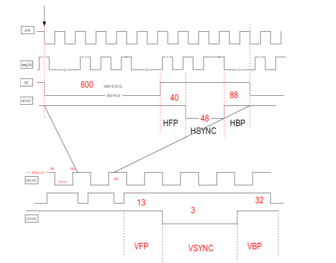 - 在 HSYNC 和 VSYNC 有效期间,DE 为高电平时,数据才被采样;