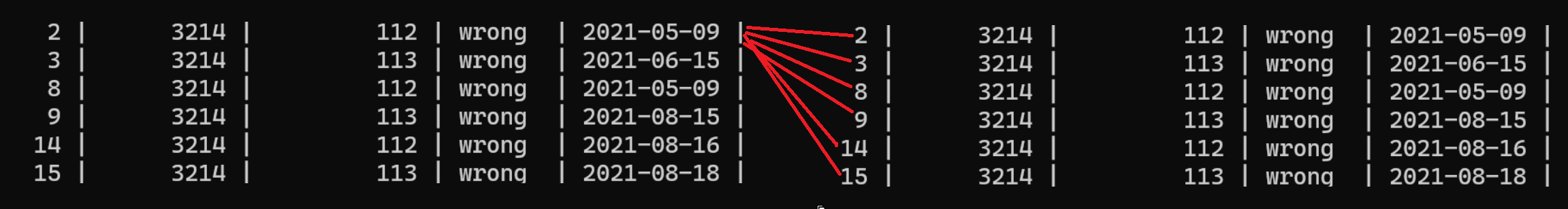 | 10 | 6543 | 111 | right | 2021-08-13 | 16 | 6543 | 111 | right | 2021-08-13 |