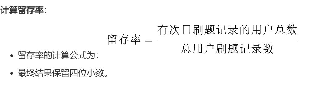 但是这里还是有点问题,我个人认为这个题目描述有问题(我的做法完全是按官方理解的意思来的)。分子应该是"用户有次日刷题的记录数"而不是"有次日刷题的用户总数",分子该是记录条数,而不是人数,但是官方这里说是人数,但实际官方的代码解答是统计的记录数,因此略有不符。