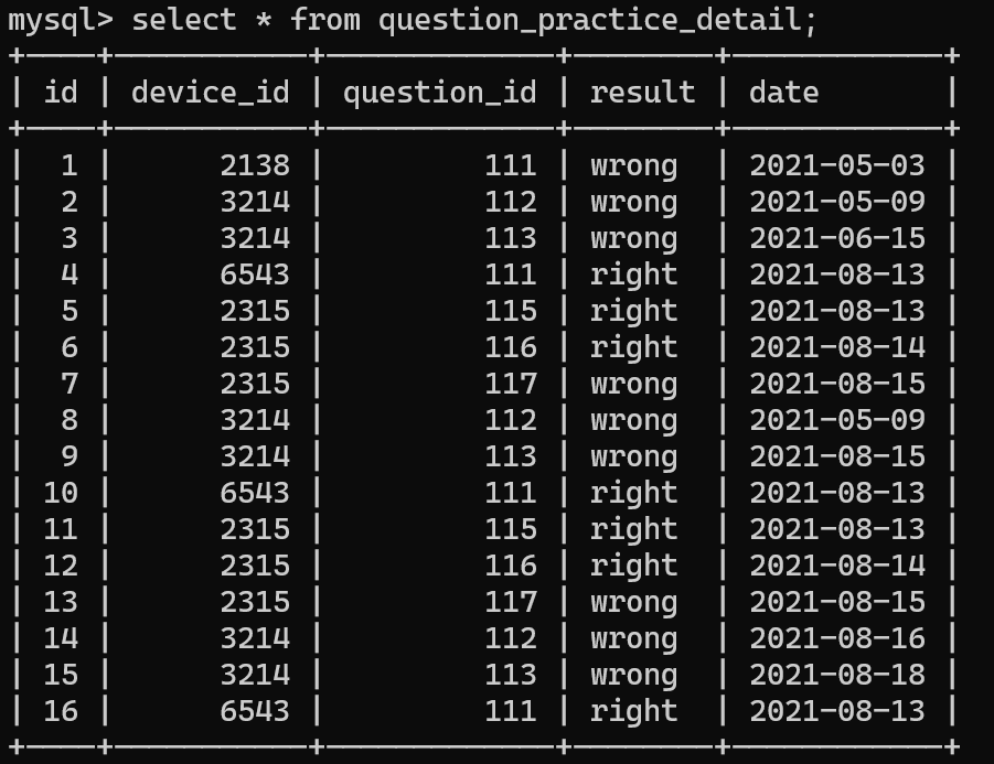 本题要求简单来说,就是想要你求一下,今天来了,明天也会来的人的总数,除以用户所有的刷题记录数,上表中question_practice_detail就是所谓的用户刷题的详情,里面记录了如下内容: