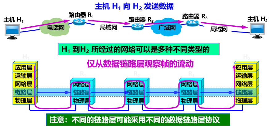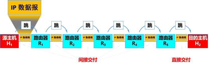 主机A(以太网) → 路由器 → 网络B(WiFi) → 路由器 → 主机C(蜂窝网络)