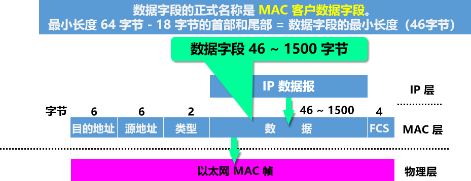 - 有效的 MAC 帧长度为 64 ~ 1518 字节之间