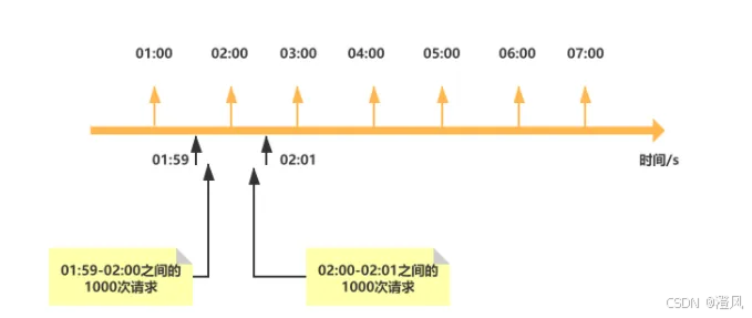 固定窗口限流:将时间划分为固定区间(如1分钟),统计每个区间内的请求数,超过阈值则拒绝。缺点是存在"边界漏洞",例如在两个相邻窗口的交界处(第59秒和第61秒),可能出现两倍阈值的请求,突破限流防线。