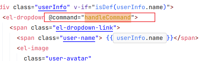 el-dropdown-item 会通过 Vue 组件的原生方法 $emit,主动向父组件 el-dropdown 派发一个「自定义事件」,事件名就是 command,并把 command 属性的值(如 logout)作为参数传过去;