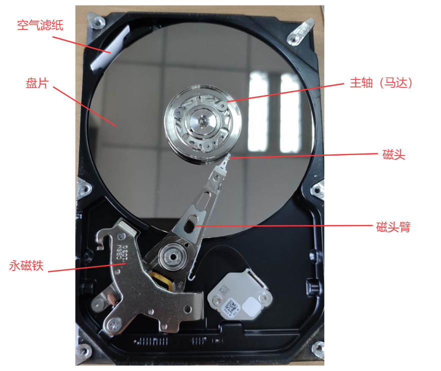 - 一张磁盘通常有三张盘片,就有六个面可以存储数据,每个面都对应着一个磁头;盘主是主轴,控制盘片的运动;磁头借助磁力臂悬浮于盘片上,并且受磁力臂的控制来左右移动。