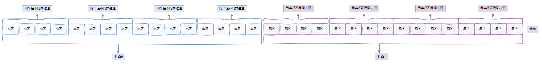 - 柱面:所有盘面的同一个磁道,即柱面展开