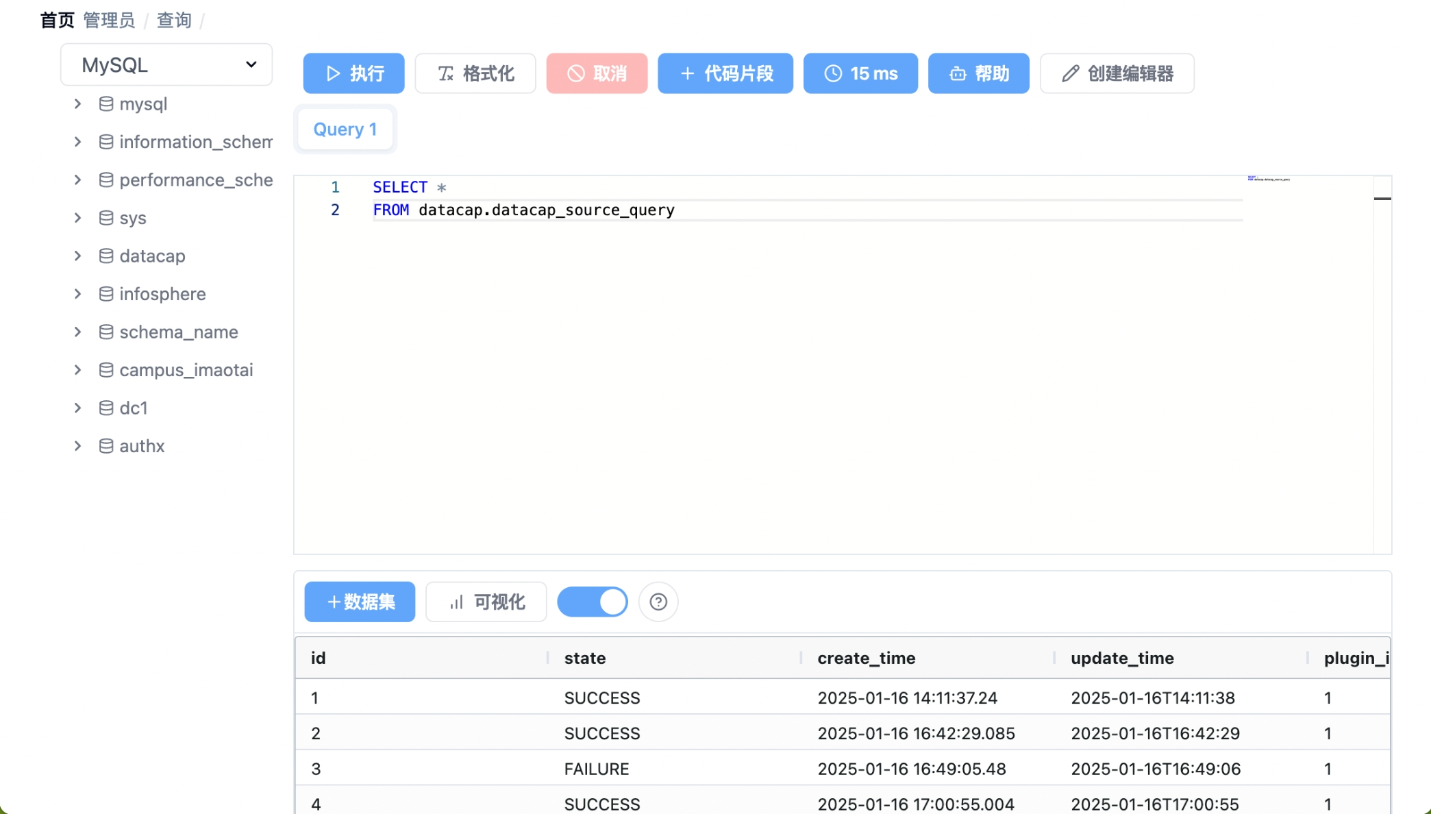 - 统一的查询语言:DataCap 将所有数据源的查询语言统一为 SQL,无论是关系型数据库、NoSQL、文件系统还是其他中间件,都可以使用 SQL 进行操作。