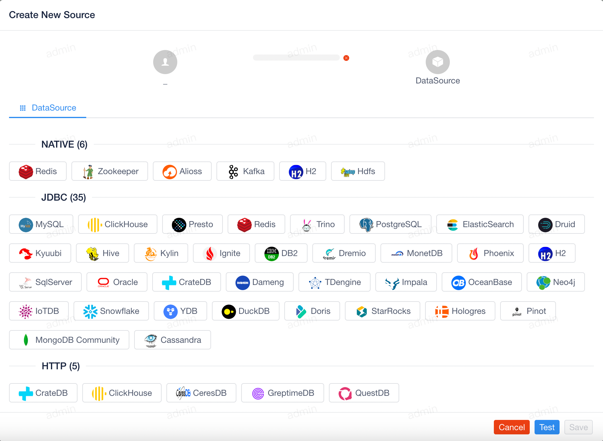 - 广泛的数据源支持:DataCap 支持超过 60+ 数据源,包括 ClickHouse、MySQL、PostgreSQL、MongoDB、Redis、Elasticsearch、Kafka 等主流数据库和中间件。