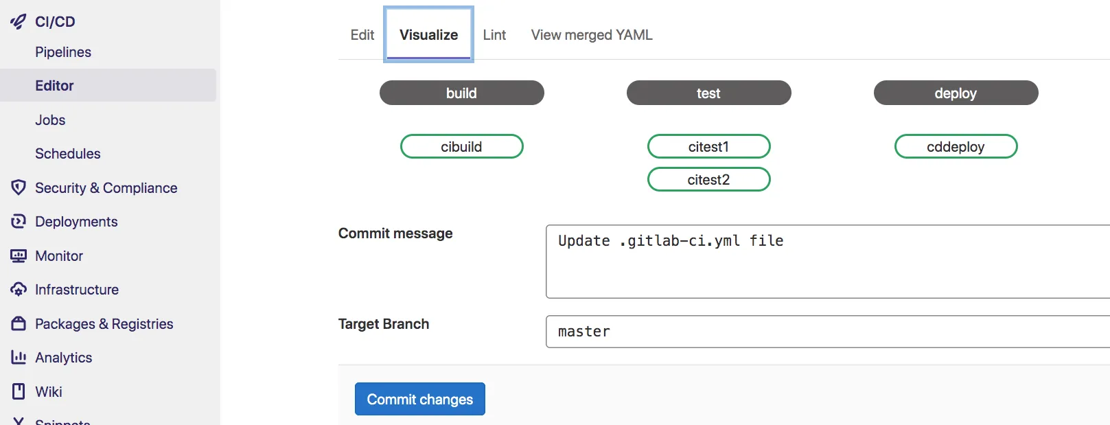 变更.gitlab-ci.yml文件后, 可以通过Visualize对CI文件中的定义进行可视化;