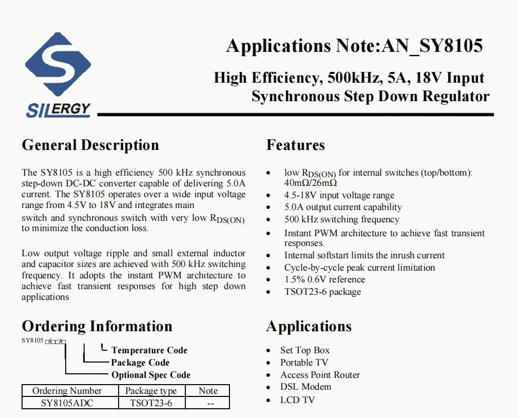 先说说基本参数。SY8105支持5V到18V的宽输入电压范围,输出电流可达5A,开关频率固定在500kHz。别看频率不算特别高,但在降压应用中已经足够用了。而且这个芯片集成度挺高的,主开关和同步开关都内置了,还用了极低RDS(ON)的MOSFET,导通损耗应该很小。