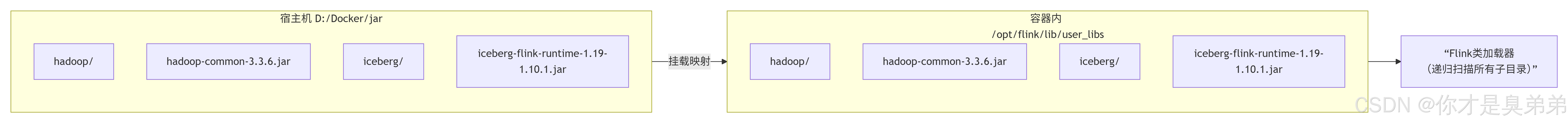 - 整理你的JAR包:确保 iceberg-flink-runtime-1.19-1.10.1.jar 和 hadoop-common-3.3.6.jar 都直接放在 D:\Docker\jar 目录下,或者在其子目录中。Flink的类加载器会递归扫描 lib/ 下的所有JAR。目录结构与类加载原理如下图: