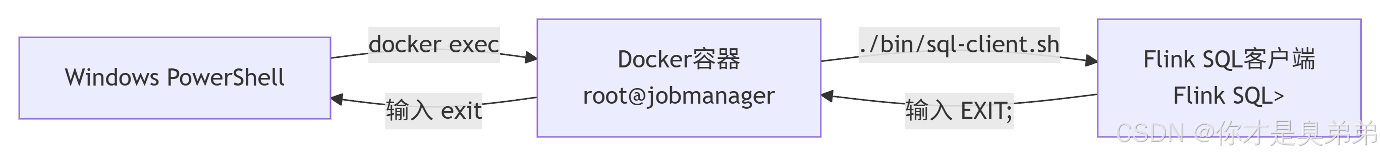 这条命令会关闭 SQL 客户端,并返回到容器内的命令行(你之前看到的 root@jobmanager:/opt/flink#)