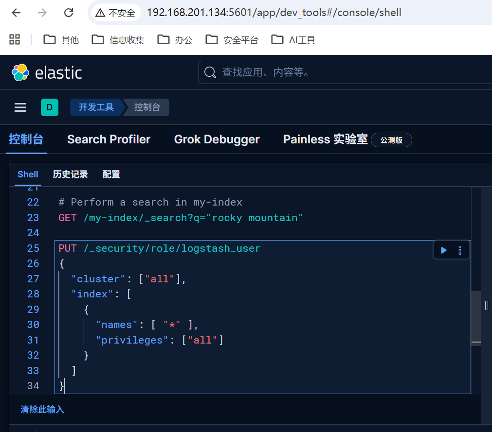 注意在es中创建logstash和kibana的用户,并且注意logstash要使用两个用户,一个logstash_user(有创建索引的权限),一个logstash_system(保留用户,无创建索引权限)与es通信。