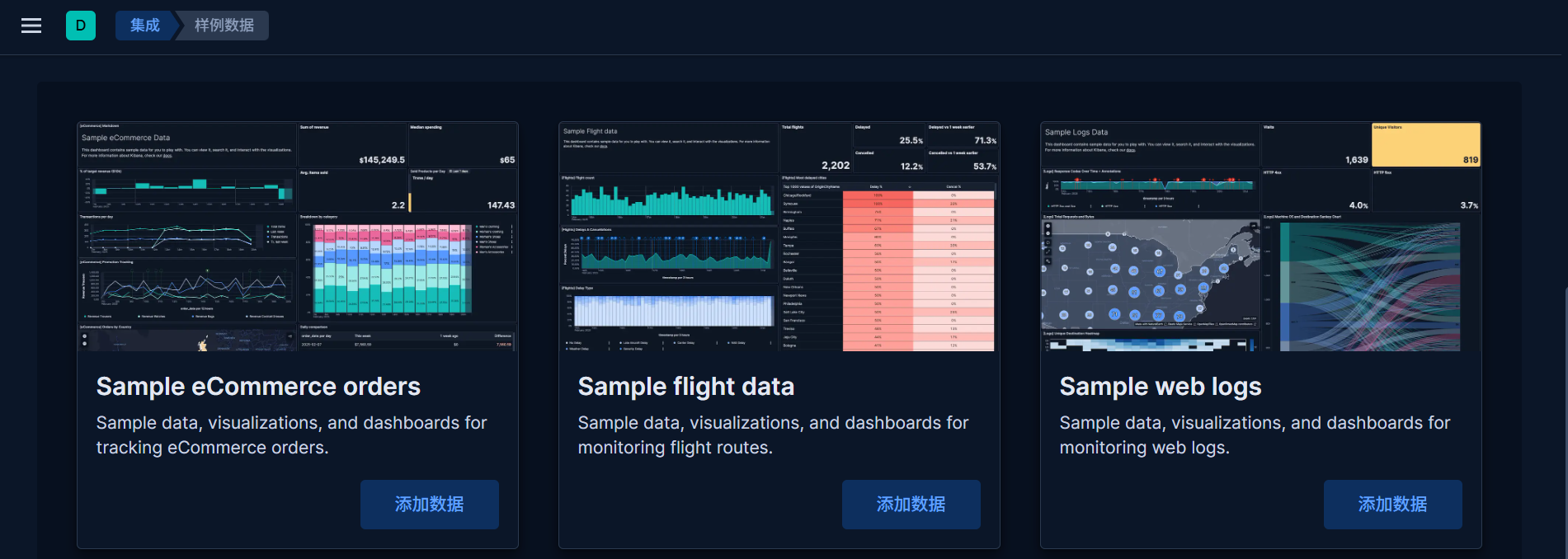 这样我们就把 Kibana 自带的三个数据集摄入到 Elasticsearch 中。上面的操作把数据加载到 Elasticsearch 中,并分别创建它们的 index patterns 也就是它们的索引模式。