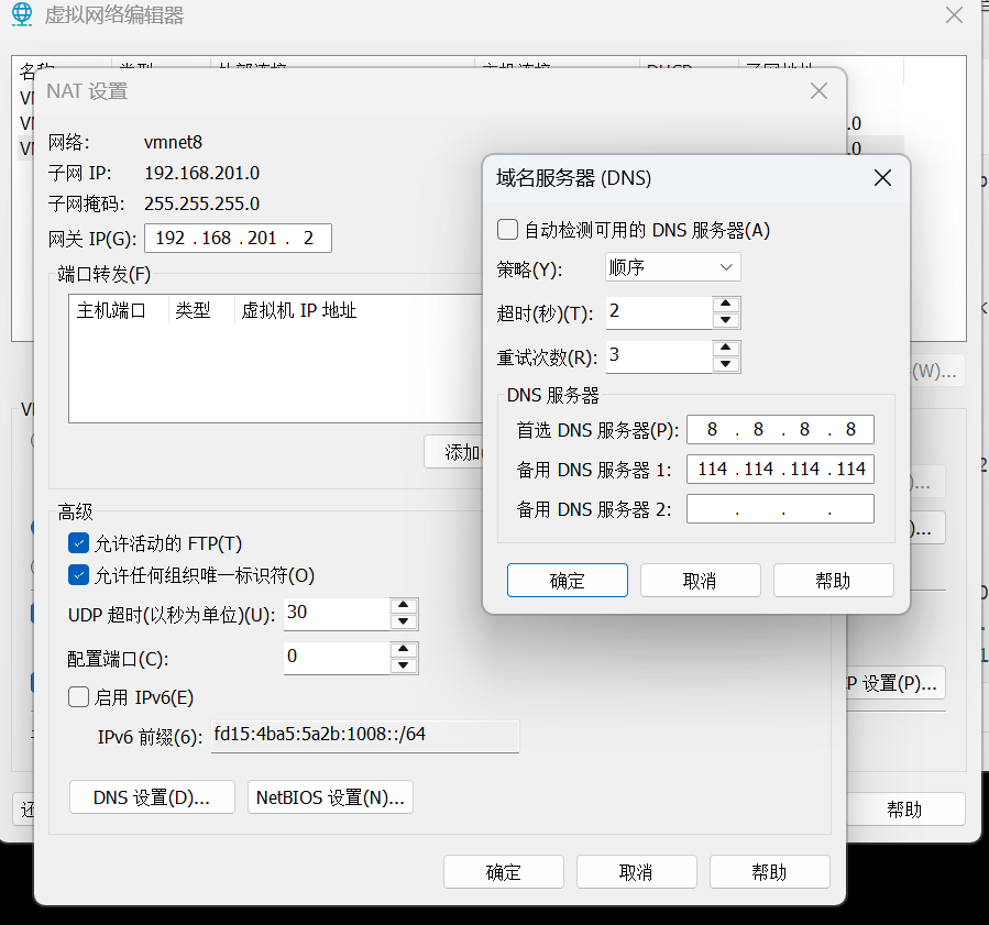 vmware 如果nat ping不通百度,尝试手动设置dns