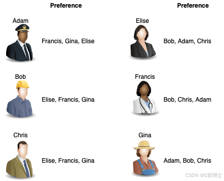 想象一场盛大的相亲派对:有n位男士和n位女士参加,每个人都对异性有自己的偏好排序。组织者希望将他们配成n对夫妻,但要求配对结果必须是稳定 的------也就是说,不存在这样一对男女:他们各自都有配偶,但彼此更喜欢对方,从而可能"私奔"破坏现有婚姻。