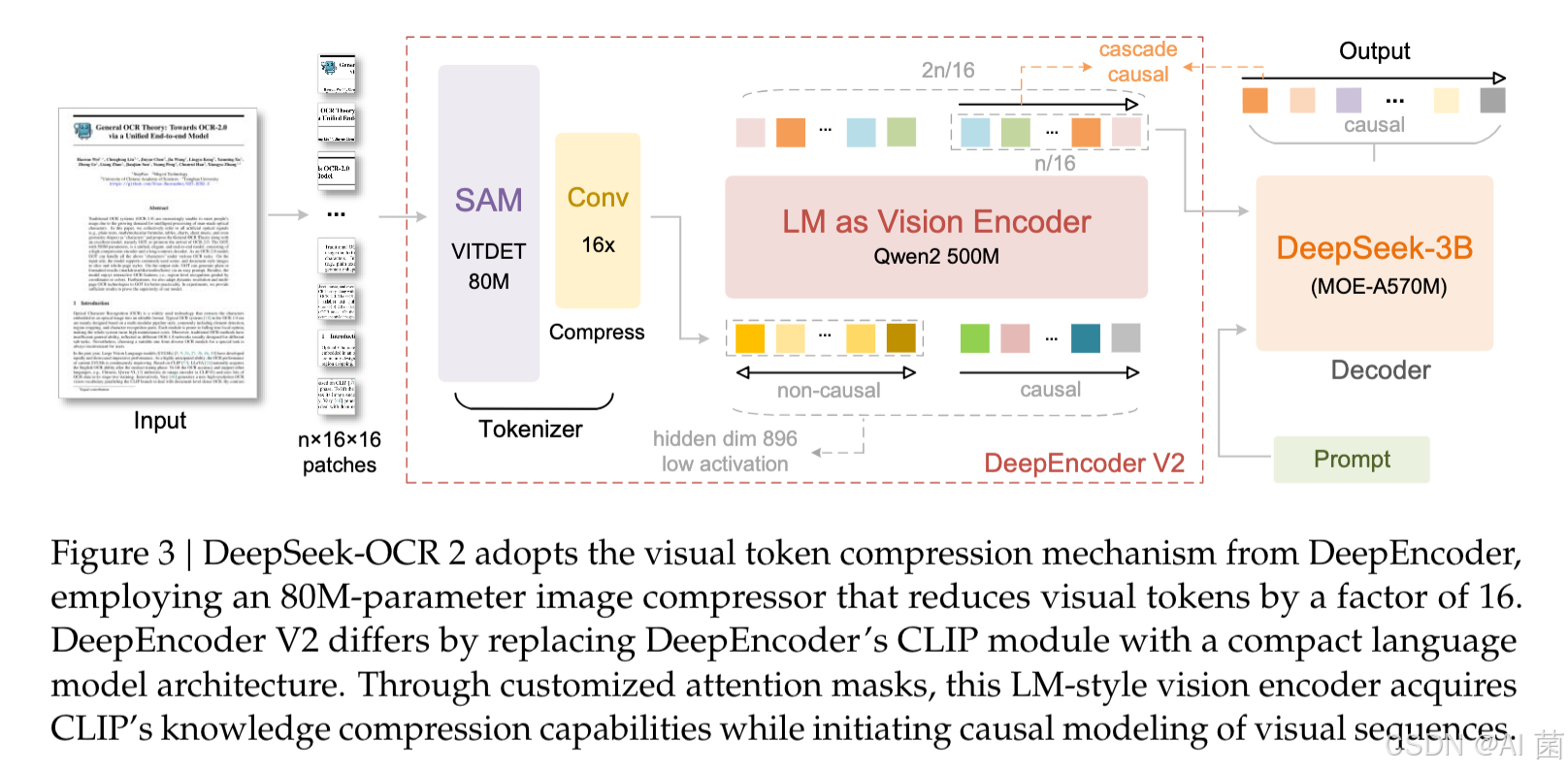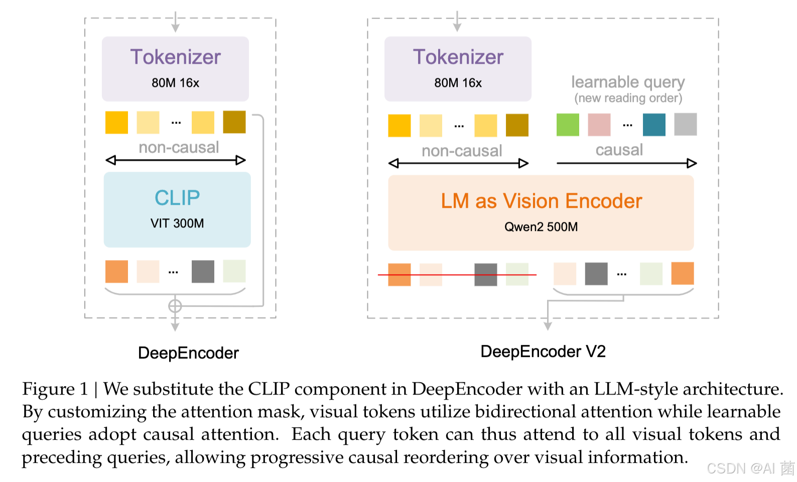 - 提出新型编码器DeepEncoder V2 ,通过融合双向注意力 和因果注意力机制,让视觉编码器具备因果推理能力,实现视觉令牌的语义驱动重排序,突破传统固定扫描顺序的限制。