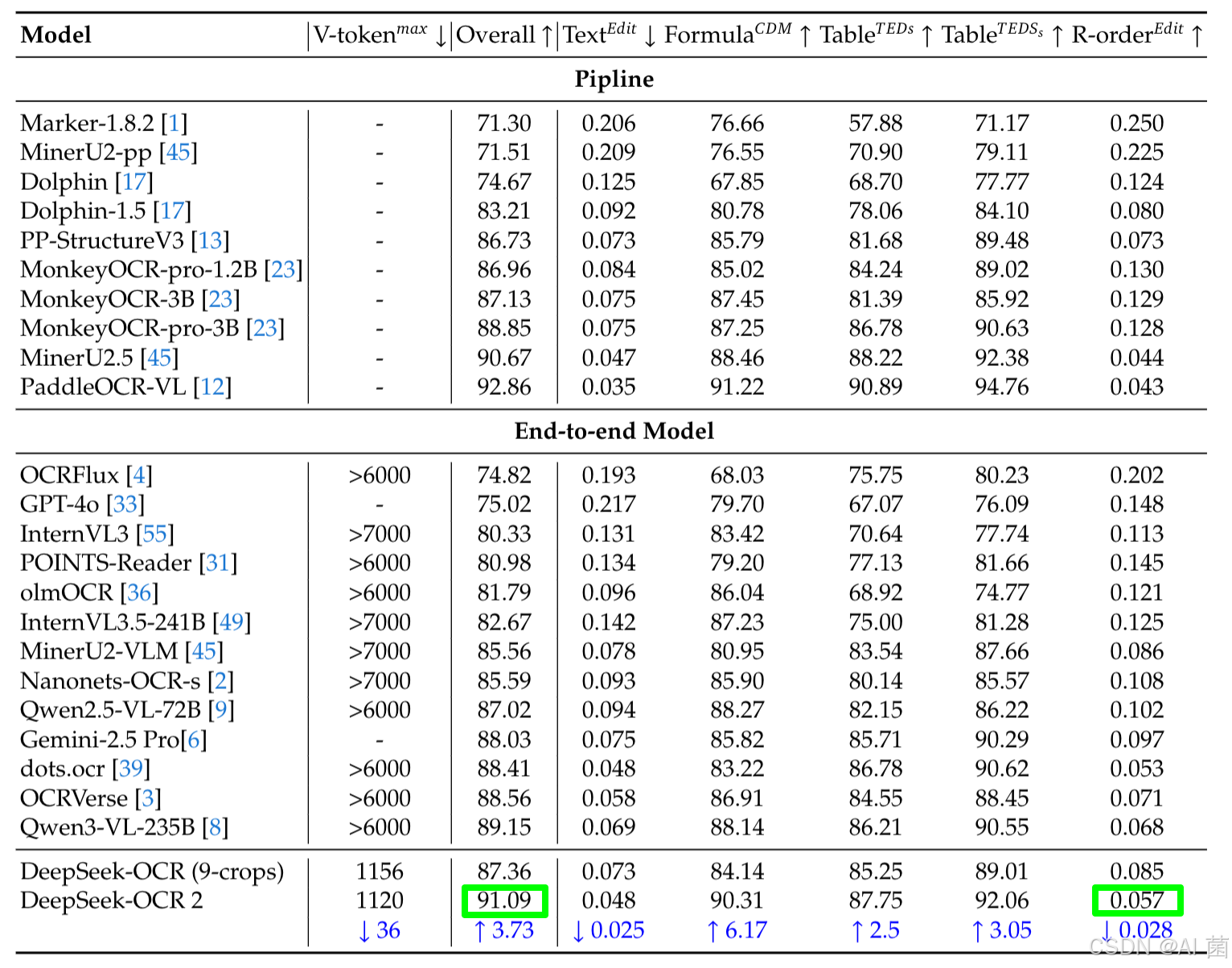 - 在OmniDocBench v1.5上,DeepSeek-OCR 2整体性能达到91.09% ,相比DeepSeek-OCR基准提升3.73%,阅读顺序编辑距离从0.085降至0.057,证明DeepEncoder V2能有效基于图像信息选择和排列视觉令牌。