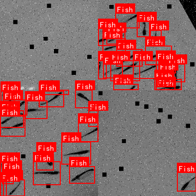 如图所示,这是一张用于鱼类目标检测与识别任务的图像样本。画面背景为带有黑色方块点缀的灰色纹理区域,模拟自然环境或水域场景。图中分布着多个红色边框标注的目标,每个边框内均有"Fish"文字标识,代表待检测的鱼类对象。这些鱼类的形态存在差异,有的呈细长条状,有的轮廓稍宽,部分鱼类因角度或遮挡呈现局部可见状态。从空间布局看,鱼类分布在画面的不同位置,既有集中成簇的区域,也有分散于各位置的个体,整体呈现出自然场景中鱼类随机分布的特征。