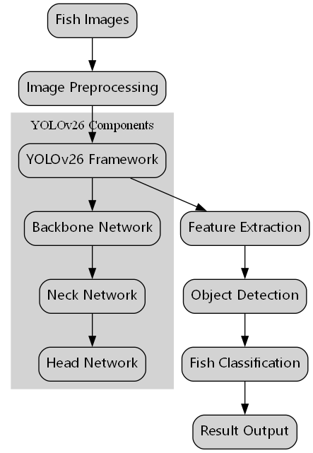 识别模块:使用改进的YOLOv26模型对预处理后的图像进行鱼类目标检测和识别,输出鱼类的位置、类别和置信度。