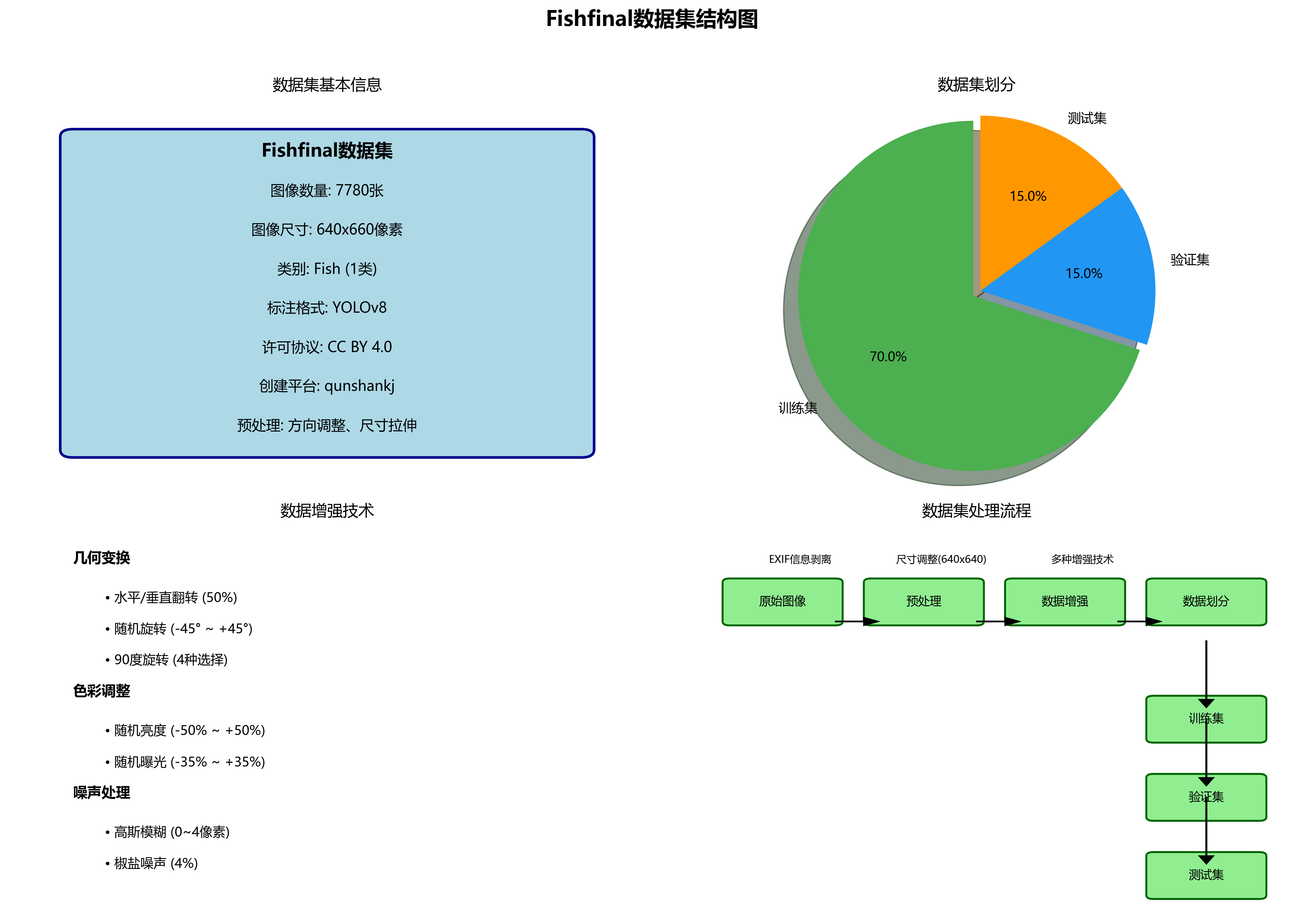 Fishfinal数据集是一个专为鱼类目标检测任务设计的计算机视觉数据集,采用CC BY 4.0许可协议发布。该数据集包含7780张经过预处理的图像,所有图像均已调整为640x640像素尺寸,并进行了EXIF方向信息剥离。数据集采用YOLOv8格式进行标注,仅包含一个类别'Fish',适用于鱼类目标检测与识别任务的研究与应用。数据集经过严格的预处理流程,包括自动方向调整和尺寸拉伸,并应用了多种数据增强技术以提高模型的泛化能力,具体包括:50%概率的水平翻转和垂直翻转、四种90度旋转(无旋转、顺时针、逆时针、上下颠倒)的等概率选择、-45度至+45度的随机旋转、-50%至+50%的随机亮度调整、-35%至+35%的随机曝光调整、0至4像素的随机高斯模糊,以及4%像素的椒盐噪声添加。数据集按照训练集、验证集和测试集进行划分,为模型的训练、评估和测试提供了完整的数据支持。该数据集的创建和标注通过qunshankj平台完成,该平台为计算机视觉项目提供了从图像收集、组织、标注到模型训练和部署的全流程解决方案。