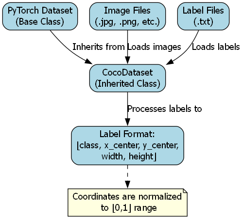 这个CocoDataset类继承自PyTorch的Dataset类,负责加载图像和对应的标签文件。每个标签文件包含边界框坐标和类别信息,格式为[class, x_center, y_center, width, height],其中坐标已归一化到[0,1]范围。