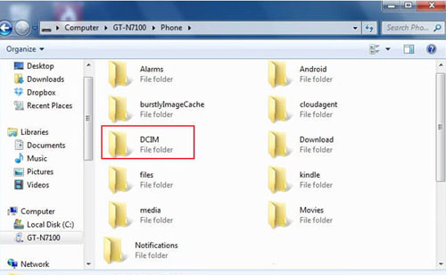 第 2 步。一旦计算机成功识别您的 Galaxy,请双击桌面上的"我的电脑/此电脑"> 在便携式设备下选择您的三星设备> 点击"DCIM"文件夹或包含媒体文件或文档的其他文件。