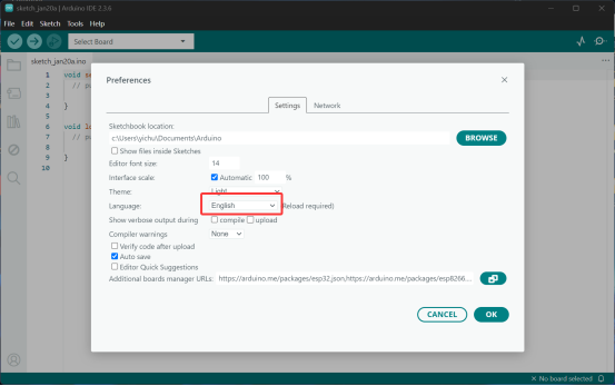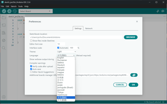 操作说明:在Arduino界面,按照提示逐步操作,修改操作界面的语言。