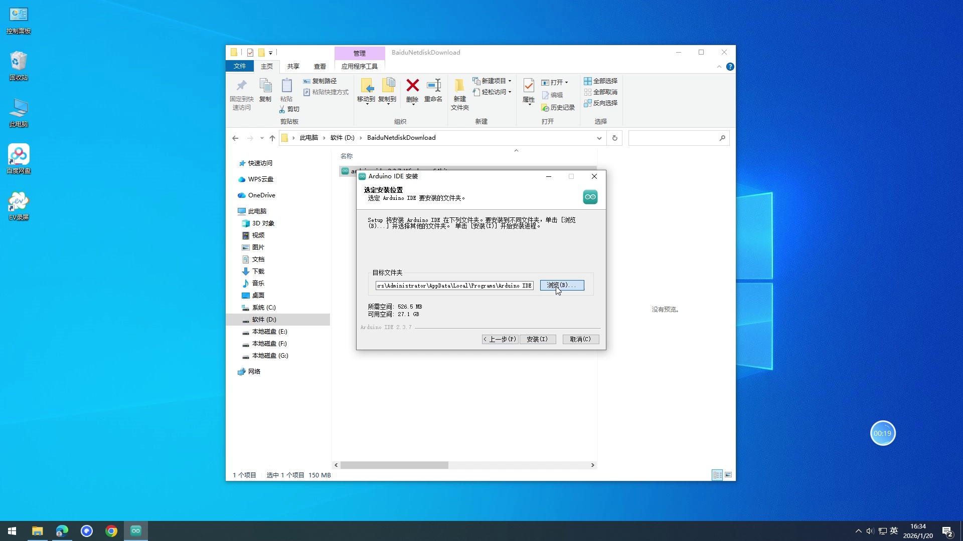 - 选择安装路径:点击"浏览"按钮,在弹出的路径选择窗口中,选择目标安装目录。建议安装在非系统盘(如D盘/Arduino),避免系统盘空间不足或重装系统后丢失程序;路径中建议无中文、空格及特殊字符(如@、#、&),防止后续运行异常