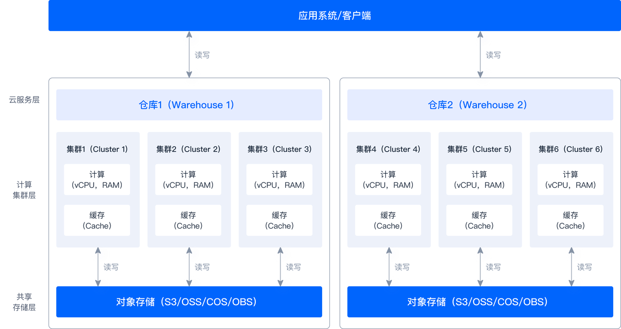 - 多集群硬隔离与数据共享:支持云原生多集群硬隔离能力,用户可以将单个实例的计算资源划分为多个逻辑集群,不同集群之间的分配独立的计算资源,实现了不同集群的严格物理资源隔离和数据共享。