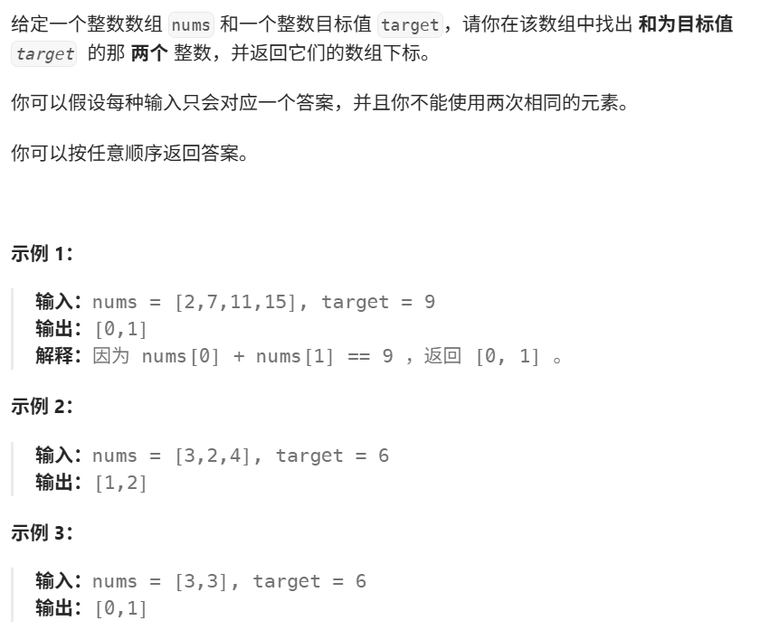 我们可以通过创建一个哈希表去存储我们的结果,逆向思维,我们要找两个和为target的数,我们可以遍历数组,看哈希表中有没有对应的target-nums[i],如果有,我们输出这两个数,如果没有,我们就将这个数存入到哈希表中,保证下一次便利的时候不会和自己匹配,同时继续看下一个数是否满足条件。