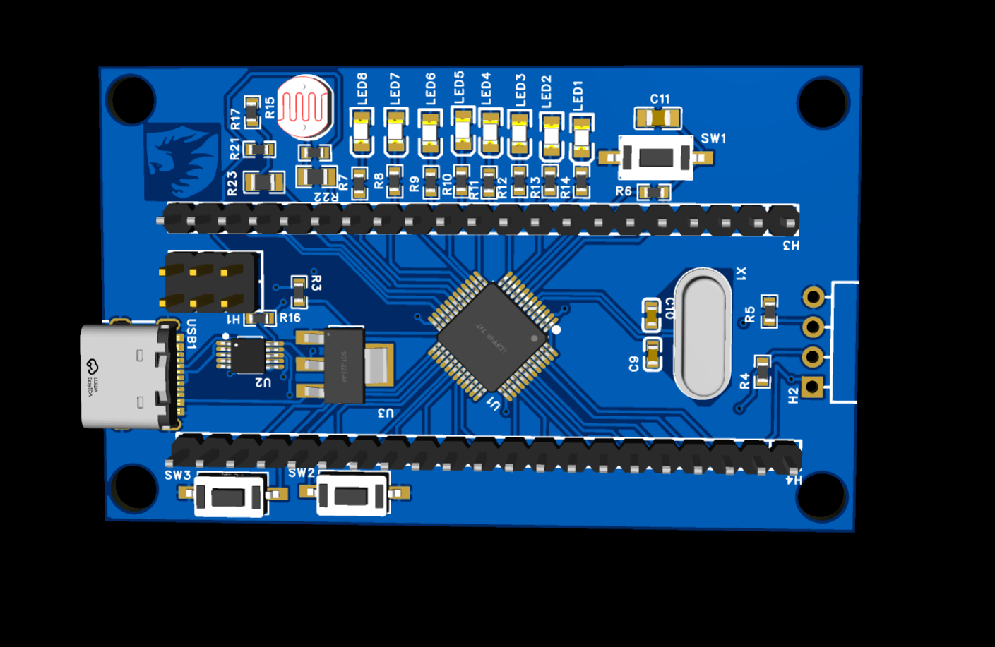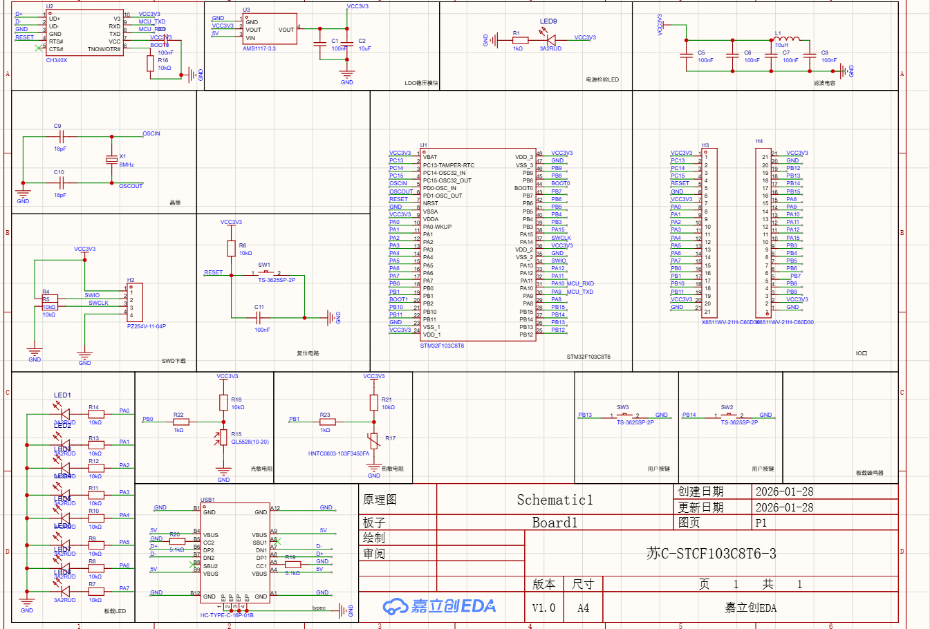 对于STM32F103C8T6集成版进行小升级,加入了光敏电阻,热敏电阻,8个小灯,两个按键,macial口改成了type-c,然后改成了自动下载