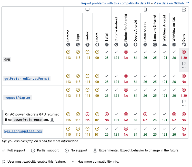 目前 WebGPU 在浏览器兼容性还存在一些问题,使用时需要特殊考虑场景。