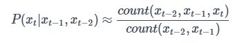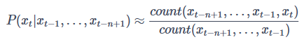 由此可以得到N元模型中,我们可以基于n-gram出现的频率来计算概率: