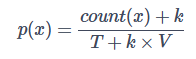 其中,P(x) 是单词 x 的概率,count(x) 是单词 x 在训练语料库中出现的次数,T 是训练语料库中单词的总数,k 是一个平滑参数,V 是单词表的大小。单词 w 的概率等于它在训练语料库中出现的次数加上 k,除以总单词数加上单词表大小乘 k 的和。这样,即使训练语料库中没有出现过的单词出现在句子中,我们也可以计算它的概率。