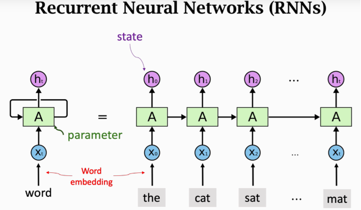 RNN模型就是假定不同的层,也就是不同的时间步,共享同一个隐藏层权重矩阵W。 这样既可以让隐藏层包含过去的全部信息,也能够减少模型参数的数量。