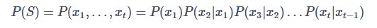 如果我们假设一个词的出现只依赖于它前一个词,而与更前面的词无关,我们就得到了二元语言模型(bigram),公式表示如下: