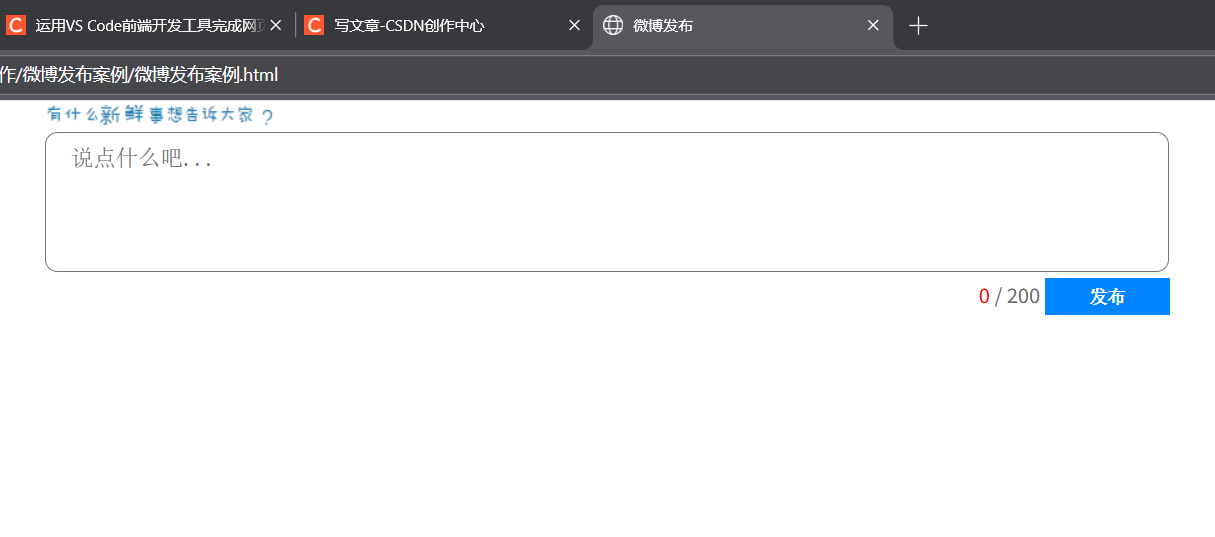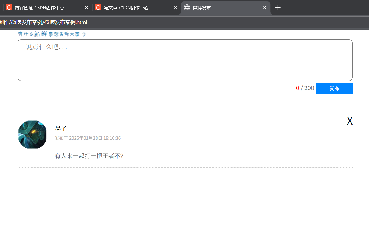发布按钮:读取输入框传给的内容,点击按钮后,输入框将变为空,长度为0,在div下方生成微博