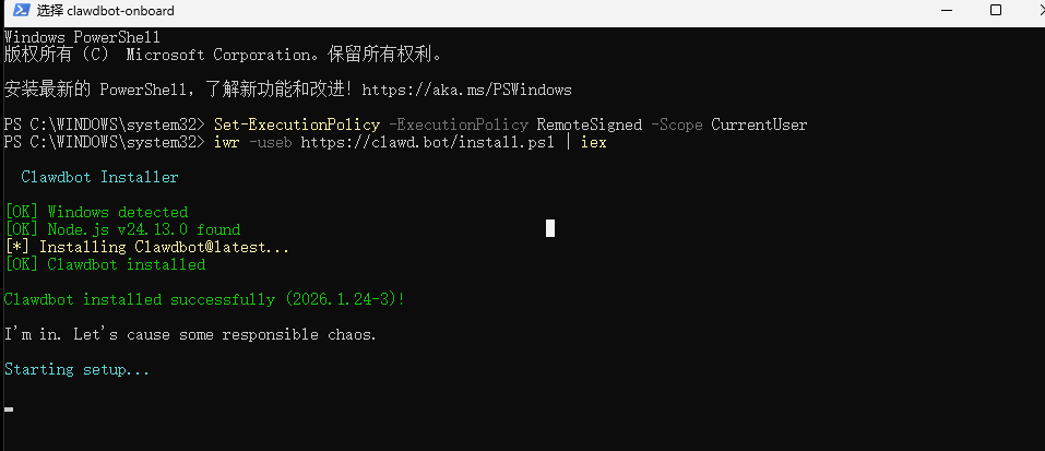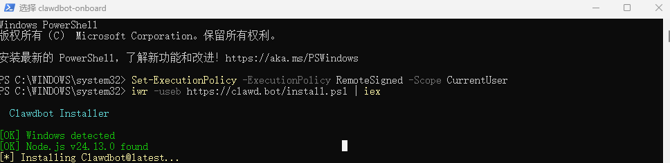 powershelliwr -useb https://clawd.bot/install.ps1 | iex -