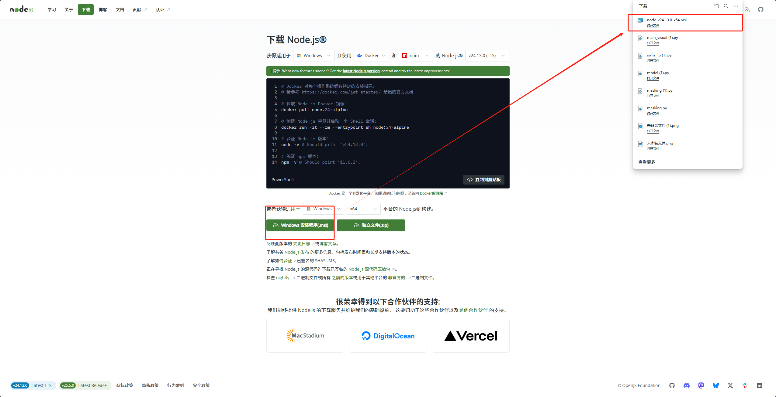 打开Node.js 官方官网,官网页面会自动识别你的系统(Windows);